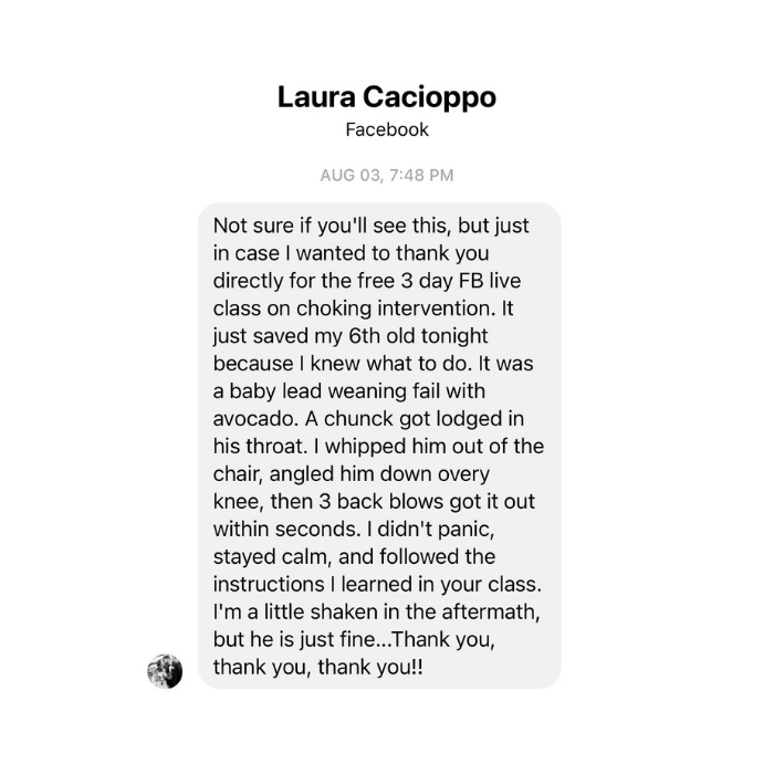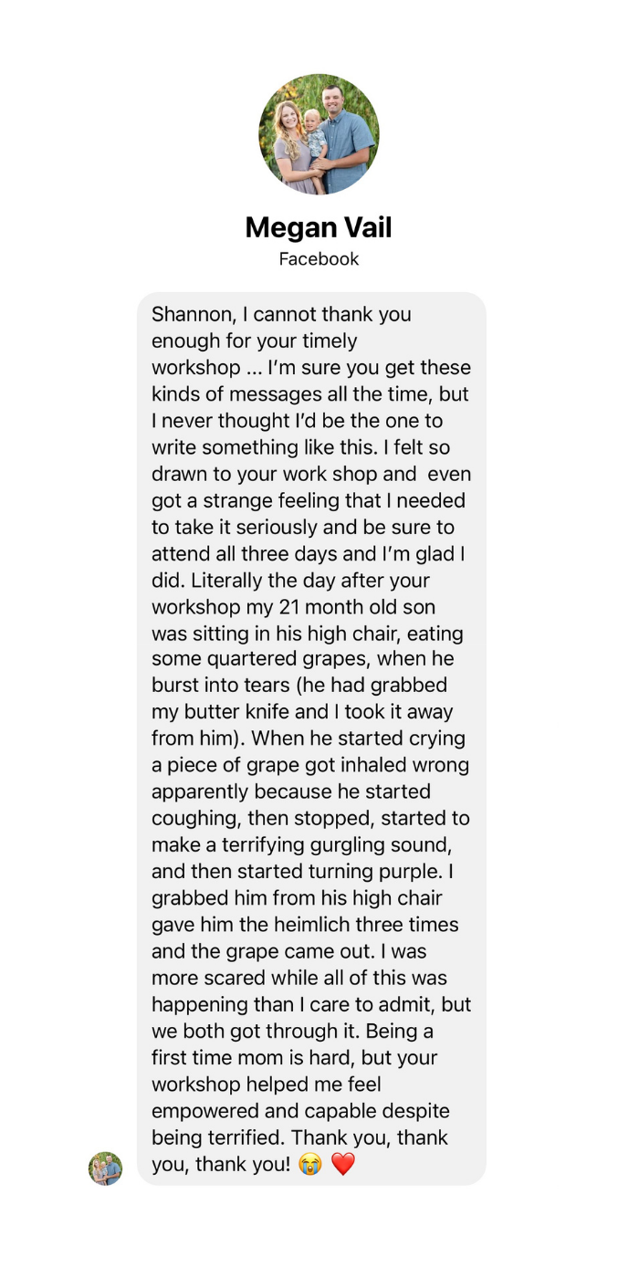 In October of 2019, I was at a restaurant with my family when my infant son starting choking! I stood from my chair and assessed the situation. Using my training as an ER nurse I immediately started back blows and chest thrusts until the object finally launched from his mouth! My sweet little boy laid limp and exhausted on my shoulder as tears rolled down my cheeks. In that moment I said to myself 'I don't ever want a mom to experience this and not know what to do!'